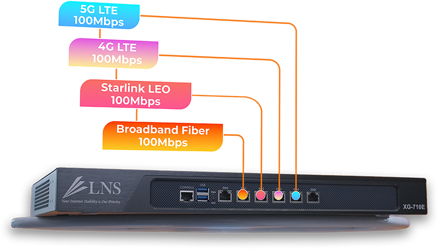 Gabungkan seluruh koneksi anda (4G/5G, VSAT), hingga Starlink ke dalam satu jaringan yang tangguh. Sistem ini memastikan operasional bisnis tetap berjalan lancar tanpa interupsi, bahkan saat salah satu provider mengalami gangguan.